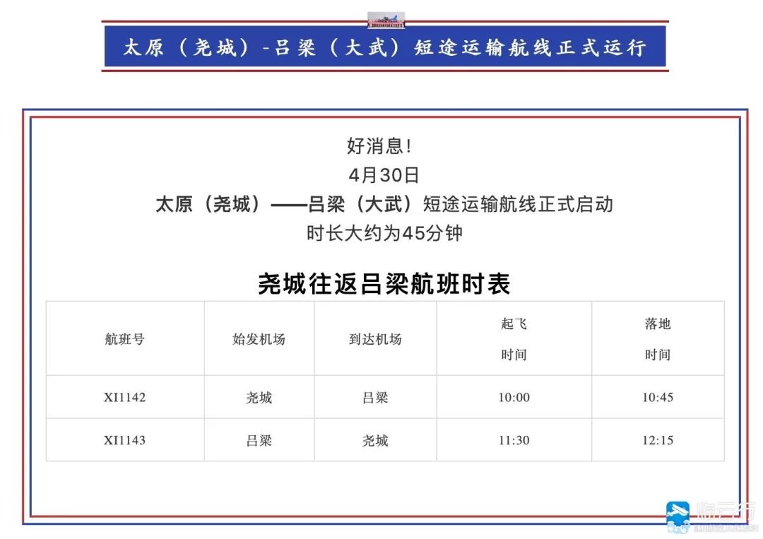 航線運(yùn)營(yíng)公司為新疆通航,選用大棕熊100型飛機(jī)執(zhí)飛,該機(jī)型可售座位為7座。呂梁至太原的機(jī)票28元起。